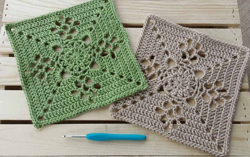 This beautiful square features an intricate lattice design that adds texture and a vintage feel to any project. It’s a great choice for sampler blankets, heirloom-style throws, or cushions where stitch detail really matters. Ideal for confident beginners looking to stretch their skills. Check it out →
