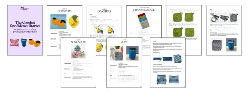 The Crochet Confidence Starter is six beginner projects designed for exactly that. Coasters, a cup cozy, a scrunchie, a headband, a granny square, a cat ear beanie.